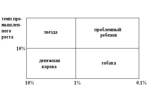 Данная матрица представляет собой схему, при помощи которой можно дать оценку товара. Горизонтальная ось показывает долю рынка, а вертикальная - темп промышленного роста. Во многом она отражает концепцию жизненного цикла товара, только по-другому. Каждый товар помещается на схеме согласно доли рынков относительно ближайшего конкурента и темпов промышленного роста. Например, продукт с долей рынка, равной доле своего наиболее значительного конкурента и с темпом промышленного роста в десять процентов, окажется в центре матрицы на пересечении.