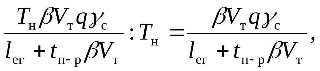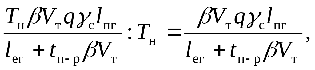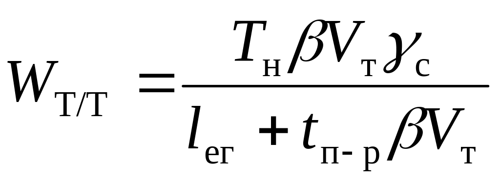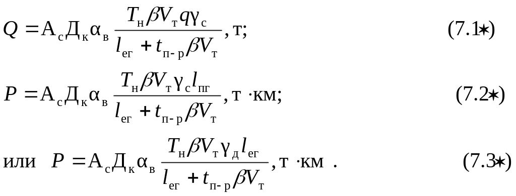 При определении производительности подвижного состава в тоннах через средние величины показателей числитель формул (7.1 и 7.1*) содержит коэффициент среднего статического использования грузоподъемности, так как произведение qγс определяет загрузку единицы транспортного средства за одну ездку. При этом знаменатель формулы всегда содержит показатель среднего пробега с грузом за одну ездку, так как выражение (lег+ tп-рβVт) − есть не что иное, как производительный пробег за одну ездку и нереализованный пробег подвижного состава из-за простоя под погрузкой и разгрузкой.