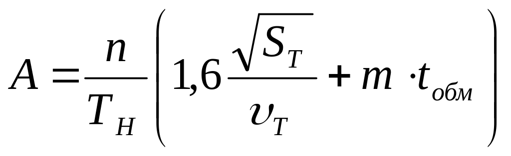 где n – частота обмена в сутки; ТН – среднее время нахождения автомобиля в наряде, ч; ST – площадь территории города, км2; υТ – техническая скорость движения автомобиля, км/час; m – общее число точек, обслуживаемых автомобильным транспортом (предприятия связи, пункты ГСП, почтовые ящики, киоски Союзпечати и т.д.); tобм – среднее время, затрачиваемое на обмен почтовой корреспонденции в одной точке, ч.