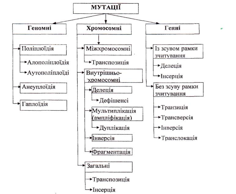 Мутації − це успадковані зміни структури генома. Оскільки основу будь-якого генома складають нуклеїнові кислоти − ДНК або РНК, то під дією мутацій відбувається, насамперед, зміна структури геномних нуклеїнових кислот. Процес виникнення мутацій, заснований на різних механізмах, називають мутагенезом. Залежно від факторів, що викликають мутації, останні прийнято поділяти на спонтанні йіндуковані. Вважається, що спонтанні мутації виникають мимовільно протягом усього життя організму в нормальних для нього умовах навколишнього середовища. При цьому широке розповсюдження дістала думка про те, що спонтанні мутації в еукаріотичних клітинах виникають із частотою 10-9...10-12 на нуклеотид за клітинну генерацію. Тепер, однак, стає ясно, що такі цифри не відображають реальності. Вони не враховують того факту, що частоти спонтанних мутацій можуть істотно (на кілька порядків) змінюватися від локуса до локуса й, швидше за все, вказують на нижню межу частоти мутацій в окремих найбільш стабільних ділянках генома.