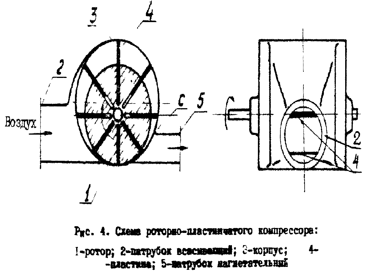 1 - ротор 2 – всмоктуючий патрубок;; 3 – корпус компресора; 4 - пластина; 5 – нагнітальний патрубок.