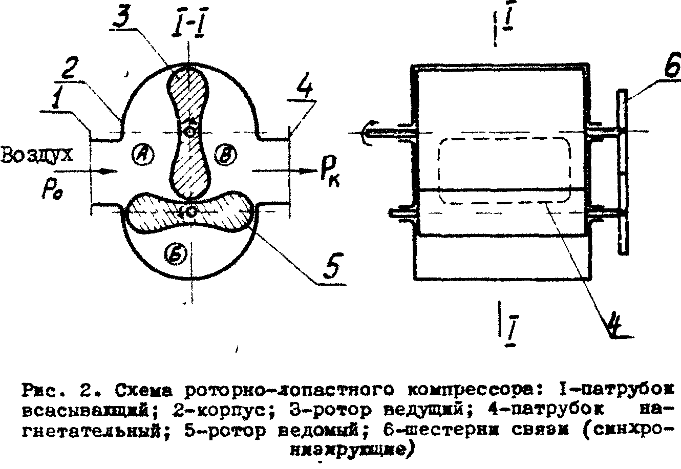 1 - вхідний патрубок; 2 - корпус компресора; 3 – ведучий ротор; 4 - нагнітальний патрубок; 5 – ведений ротор; 6 – синхронізаційні шестерні.