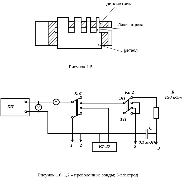 Она состоит из блока питания, цифрового вольтметра В7-27 и зондового устройства. Кнопка Кн2 служит для выбора режима подгонки; ЭП – электроэрозионная; ТП – токовая. Кнопка Кн1 служит для включения схемы измерения или подгонки. Сопротивление R ограничивает ток при электроэрозионной подгонке. В конденсаторе С происходит накопление энергии для импульса при электроэрозионной подгонке.