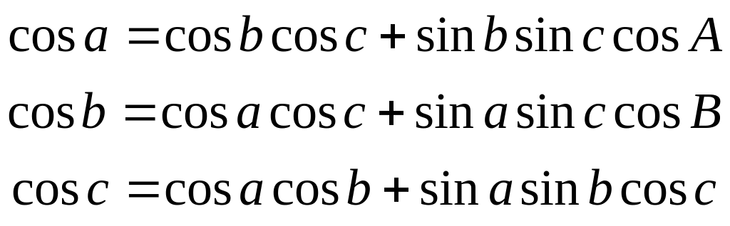 В сферическом треугольнике даны три стороны: a = 123047,2; b = 7102,7; c = 161018,4. Написать программу для определения А, B и С, используя расчетные формулы: