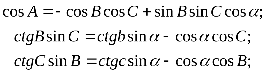В сферическом треугольнике даны два угла и сторона между ними: = 14027,3; В = 100013,5; С = 56044,7. Составить программу для нахождения А, b и С, используя расчетные формулы: