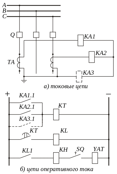 При возникновении повреждения на защищаемой линии срабатывают токовые реле тех фаз, по которым проходит ток КЗ. При этом у реле замыкаются контакты. Сработавшие ИО воздействуют через логический элемент ИЛИ на орган времени KT, который по истечении заданной выдержки времени выдает сигнал, приводящий в действие исполнительный орган KL. Последний срабатывает и подает напряжение от источника оперативного тока в ЭО выключателя YAT. После отключения повреждения ток КЗ прекращается, ИО и все элементы РЗ возвращаются в исходное состояние. Для успешного размыкания тока, проходящего по ЭО (YAT), контактами промежуточного реле KL после отключения КЗ в цепи выключателя предусматривается блокировочный вспомогательный контакт SQ, положение которого совпадает с положением выключателя. При включенном выключателе контакт SQ замкнут и размыкается при отключении выключателя Q, разрывая цепь тока ЭО выключателя YAT.