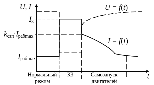 Характер изменения тока и напряжения при КЗ в сети и после его отключения с учетом режима самозапуска электродвигателей представлен на рис. 2.7.