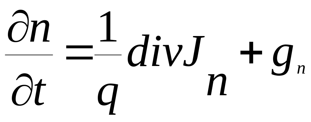 Здесь р и n — концентрации дырок и электронов; q — заряд электрона; Jp и Jn — плотности дырочного и электронного токов; gp и gn — скорости процессов генерации-рекомбинации дырок и электронов; Е — напряженность электрического поля; ρ — плотность электрического заряда; ε и ε0 — диэлектрическая проницаемость и диэлектрическая постоянная.
