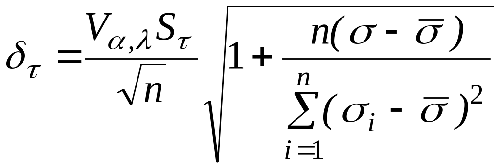 де Vα,λ – коефіцієнт, що приймається за таблицею 8, залежно від однобічної довірчої ймовірності α, параметра λ, який обчислюється за формулою (3.10), та числа ступенів свободи К=n-2; σі – дослідні значення нормального напруження: