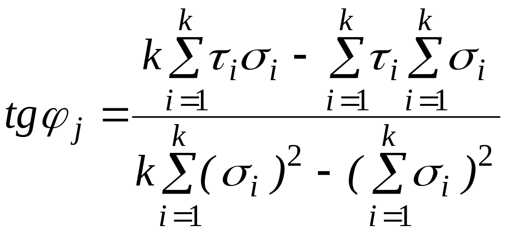 2.1. При статистичній обробці часткових значень tgφj та cj, для кожної j-ї точки випробування ґрунту в межах ІГЕ обчислюють за методом найменших квадратів часткові значення tgφj і cj за результатами не менше від трьох визначень опору ґрунту зрізу τі при різних значеннях нормального напруження σі у межах однакового діапазону σі :