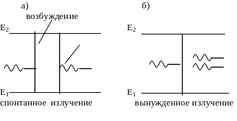 Излучение энергии атомом, при котором переход из метастабильного состояния в основное вызывается электромагнитным излучением соответствующей частоты называется вынужденным, или индуцированным, излучением (рис.15.1б).