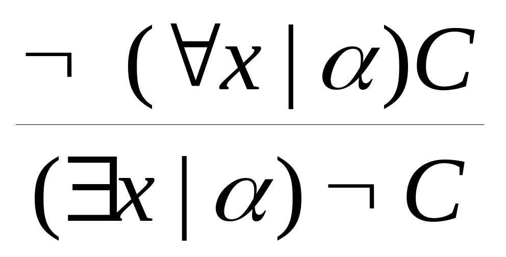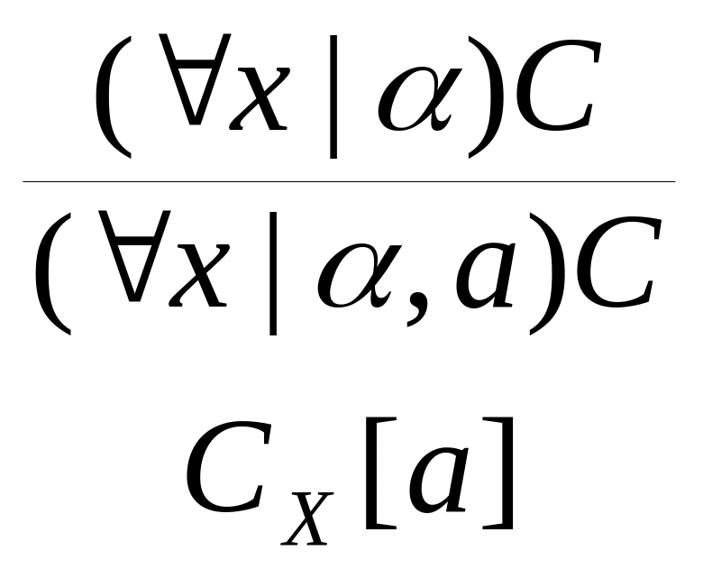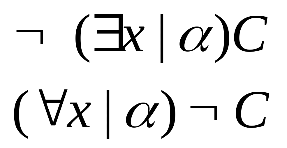 Уточнения, как и прежде, требуют правила () и (), а именно, если формула (x| α) C принадлежит ветви W, то для любого aD' формула Cx [a] также ей принадлежит; если формула (x| α) C принадлежит W, то, по крайней мере, для одного a D' формула Cx [a] принадлежит W.