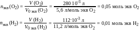 Число моль эквивалентов поглощенного О2 и выделившегося Н2 на катоде