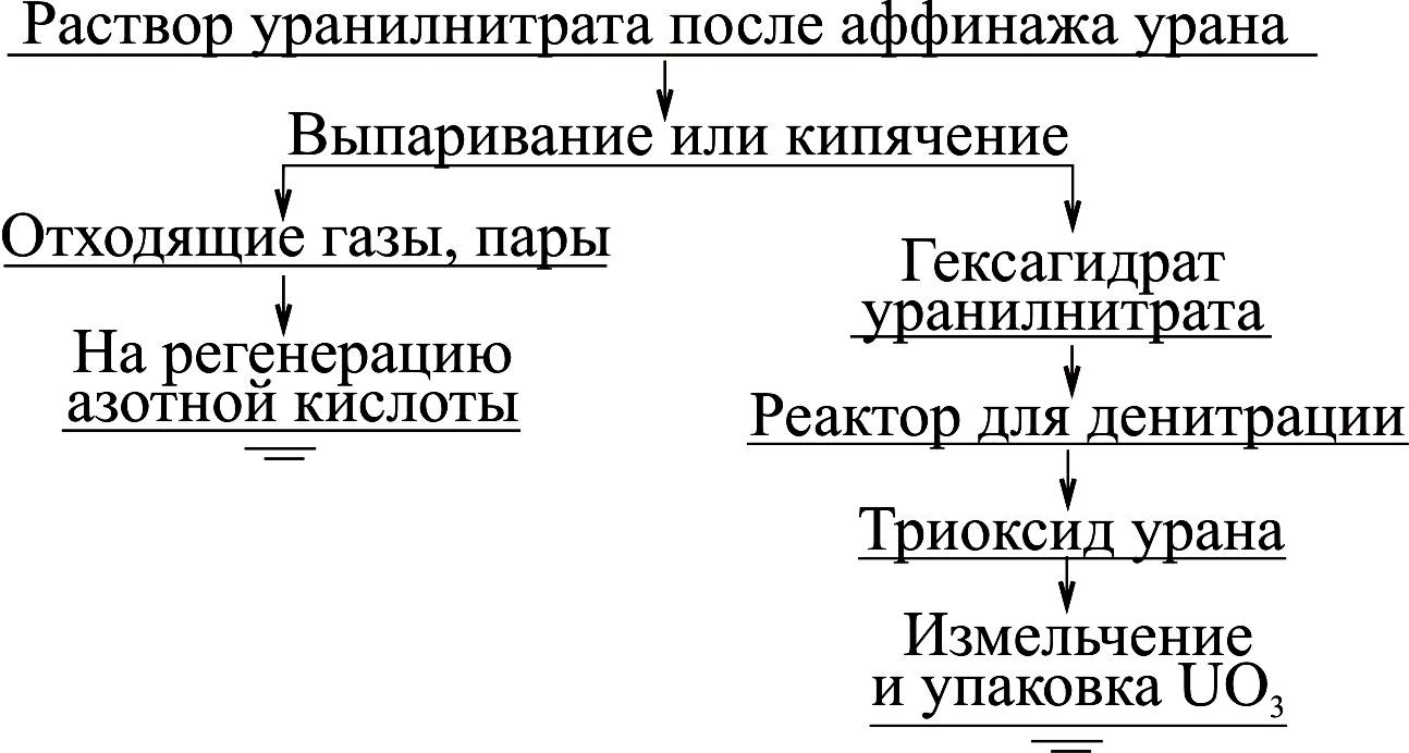 Очищенный раствор уранилнитрата после аффинажа урана выпаривают до концентрации, соответствующей составу UO2(NO3)2·6H2O гексагидрата уранилнитрата. Дальнейшее прокаливание гексагидрата уранилнитрата происходит в реакторе для денитрации, где протекает дополнительная дегидратация и денитрация продукта с образованием триоксида урана по реакции