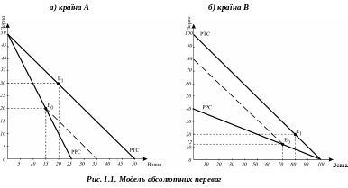 Розглянемо модель абсолютної переваги. Припустимо, що країни А і В виробляють два товари – зерно та вовну. Виробничі можливості країни А дозволяють їй виробляти 50 т зерна або 25 т вовни, країни В – 40 т зерна або 100 т вовни. Їх ілюструють відповідні криві внутрішніх виробничих можливостей (рис. 1.1).