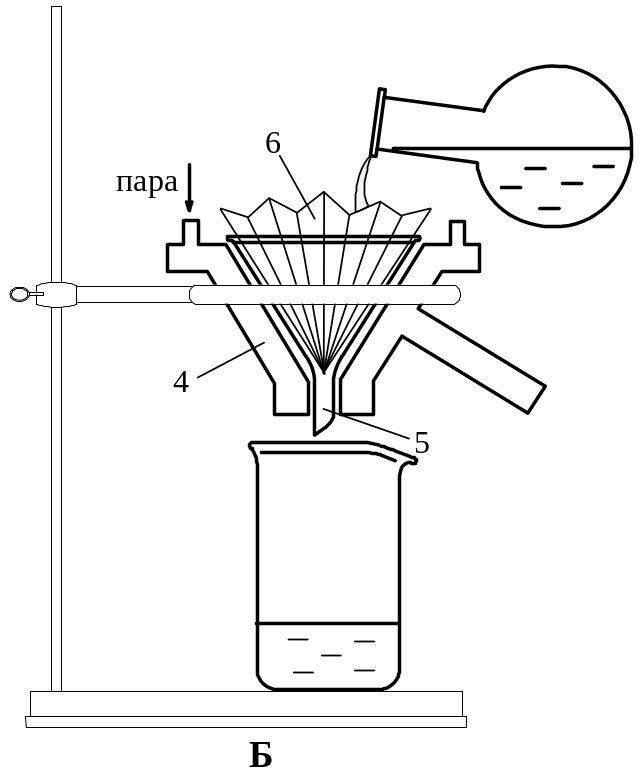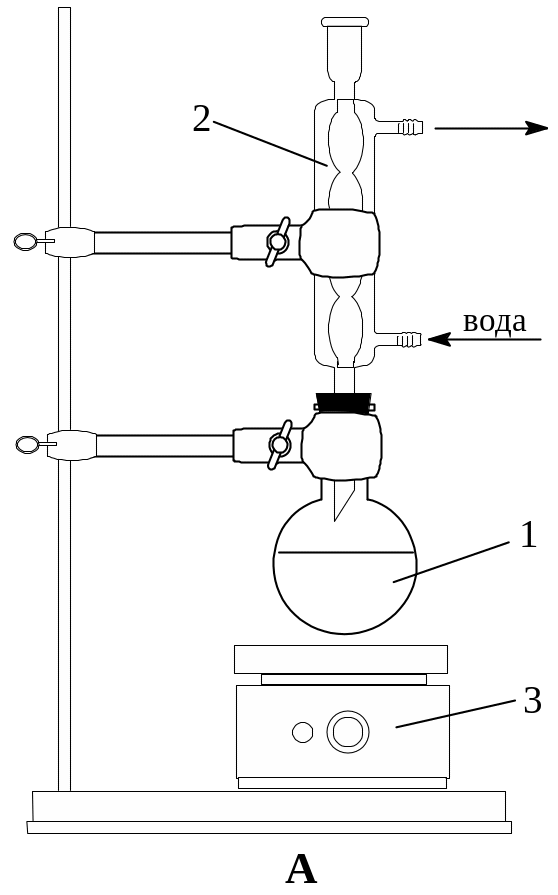 A. Прилад для синтезу п-толуолсульфонату натрію. 1 – круглодонна колба, 2 – зворотний холодильник, 3 – електрнагрівач. Б. Прилад для гарячого фільтрування. 4 – воронка для гарячого фільтрування, 5 – хімічна воронка, 6 – складчастий фільтр. В. Прилад для фильтрування під вакуумом. 7 – воронка Бюхнера, 8 – спеціальна пробірка, 9 – проміжна склянка. |