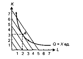 Для решения задачи минимизации затрат на заданный объем производства Х, совместим заданную изокванту с картой изокост.