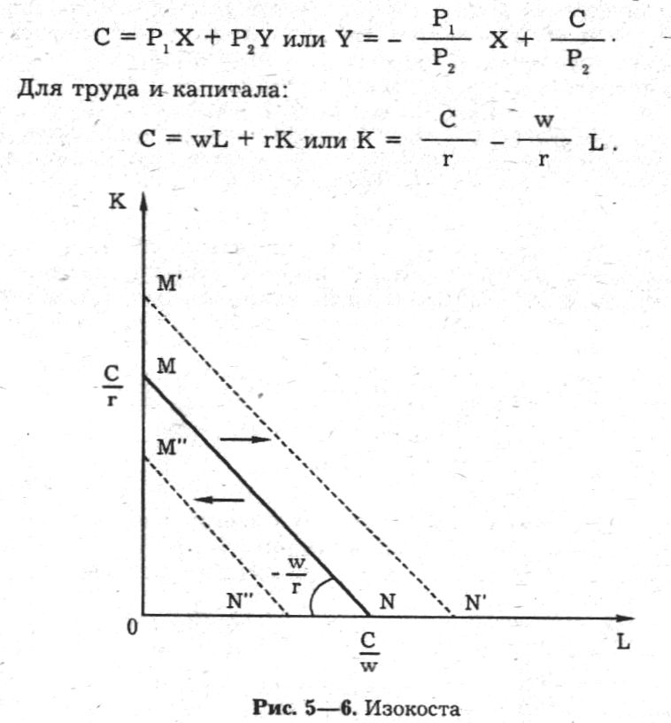 Наклон изокосты зависит от соотношения цен. Нисходящий характер изокосты означает, что, двигаясь по ней сверху вниз, мы сокращаем затраты на приобретение капитала и увеличиваем их на приобретение дополнительных единиц труда. Однако совокупная величина затрат остается все время постоянной. Исходя из данного положения, можем записать следующее равенство: