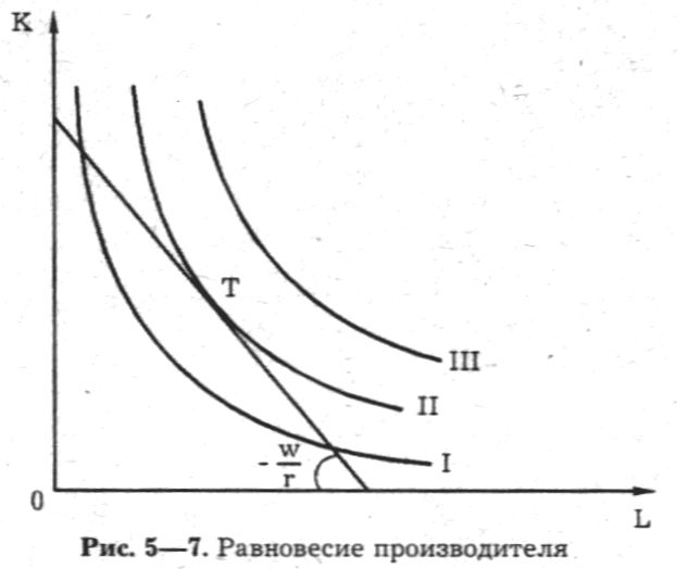 Из рис. 6.11 видно, что для максимизации объема выпуска фирма применяет комбинацию факторов, соответствующую точке Т. Фирма не в состоянии осуществлять объем выпуска, соответствующий изокванте Ш ибо последние ни в одной точке не соприкасаются с изокостой. Для перехода на более высокую изокванту фирме необходимы дополнительные производственные факторы (капитал и труд). Следовательно, в точке Т производитель находит оптимальное сочетание труда и капитала. Учитывая, что в точке Т изокванта и изокоста имеют одинаковый наклон и что наклон изокванты измеряется предельной нормой технического замещения, можно записать условие равновесия как