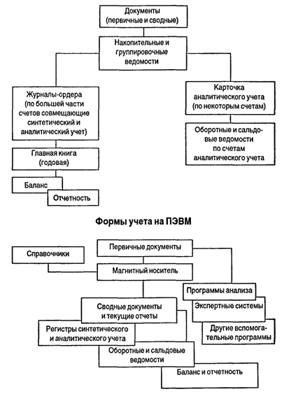 Схематично сравнение ручных (на примере журнально-ордерной формы) и компьютерных форм учета можно представить следующим образом: