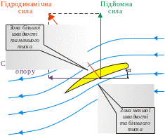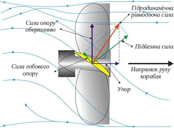 Сила, що з'явилася внаслідок різниці тисків води по обох сторони лопати гребного гвинта при обтіканні її потоком води, називається гідродинамічною силою, що є рівнодіючою двох сил: більша з них спрямована перпендикулярно потоку і називається піднімальною силою, а менша спрямована паралельно потоку і є силою лобового опору лопати. Таким чином, гідродинамічна сила залежить від швидкості потоку, розмірів лопати, кута атаки й форми лопати.