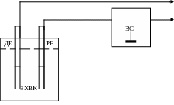 Рис. 2. ЕХВК – електрохімічна вимірювальна комірка, що являє собою посудину з досліджуваним розчином, у який занурені робочий електрод РЕ та допоміжний електрод ДЕ. До робочого електрода підключається вимірювач струму ВС. На допоміжний електрод подається напруга Uо.