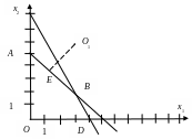 ОДР – 4-угольник ОАВD (рис. 2). Линиями уровня целевой функции являются концентрические окружности с центром в точке О1(3;6) с радиусами 0r5. Минимум находится в точке О(0;0) как самой удалённой от точки О1, и равен zmin=-20. Максимум находится в точке Е, как самой ближайшей к О1 точки ОДР. Точка Е находится на пересечении прямой АВ x1+x2=5 и перпендикуляра к этой прямой, проведённого из точки О1. Т.к. угловой коэффициент прямой x1+x2=5 равен -1, то угловой коэффициент перпендикуляра О1Е равен 1. Из уравнения прямой, проходящей через данную точку О1 с угловым коэффициен-