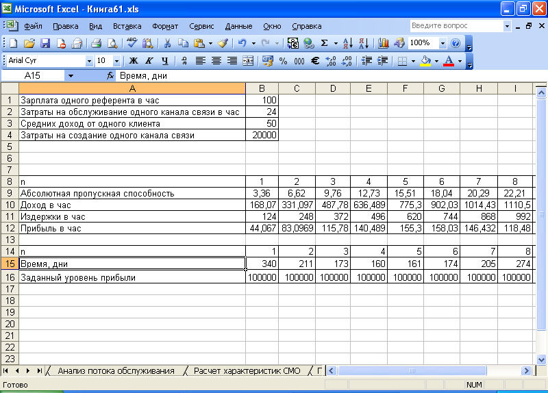 Переходим на лист «Анализ потока обслуживания». Оформляем таблицу 1.2. Создаем таблицу