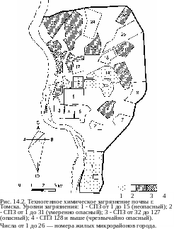 В результате исследования установлено, что практически вся территория города представляет собой техногенную геохимическую провинцию, включающую участки с различными СПЗ. СПЗ, равный 2—15, считали слабым, 16—31 — средним и 32 и выше (до 128) — сильным загрязнением (рис. 14.2). Корреляционный анализ уровня загрязнения почвы микрорайонов Томска и заболеваемости (по группам болезней) проживающих в них детей не всегда показывал достаточно достоверную тесноту связи.