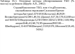 Основными методами обезвреживания ТБО, способными обеспечить санитарную очистку населенных мест, являются депонирование на полигонах захоронения или свалках (ликвидационный механический), компостирование в полевых условиях с получением органического субстрата для удобрения полей, биотермическая переработка на индустриальных предприятиях с получением компоста или биотоплива (утилизационный биологический), а также мусоросжигание (ликвидационный термический). Названные методы в нашей стране, по неполным данным, составляют: депонирование — 87,5%, переработка в компост — 6,5%, сжигание — 5%, прочие методы — 1% от массы ТБО. Данные по зарубежным странам представлены в табл. 16.1.
