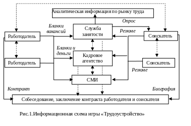 В качестве примера может быть рассмотрена информационно-логическая схема игры «Трудоустройство», представляющая отношения между вышеперечисленными субъектами рынка труда (прил. 1). Можно заметить, что именно деятельность посредников формирует рынок труда. Как мы видим, по данной схеме можно легко составить описание роли каждого субъекта рынка труда, проследить взаимоотношения с другими субъектами и объектами, запланировать необходимые псевдодокументы (игровые формы документов), исходные данные, инструкции и т. д.