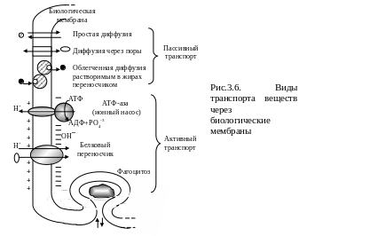 Активный транспорт осуществляется с затратой энергии АТФ и может идти как против, так и по градиенту концентрации. Каждый вид молекул или ионов, активно транспортируемых в клетку или из клетки, имеет свой собственный белковый переносчик. Большинство переносчиков производят транспортировку за счет энергии мембранного электрического потенциала. Этот потенциал создаётся сложными белковыми комплексами (около 20 белков), получившими название АТФ-азы. Эти комплексы способны расщеплять АТФ на аденозиндифосфорную кислоту (АДФ) и фосфат. При этом выделяющаяся энергия макроэргической связи (см. п.3.7) так конформирует белки АТФ-азного комплекса, что они перебрасывают положительно заряженные ионы (Н+ или Nа+) с внутренней стороны мембраны на внешнюю. Таким образом, с внутренней стороны образуется избыток отрицательных ионов (ОН¯, Cl¯, SO42-), а снаружи – положительных.