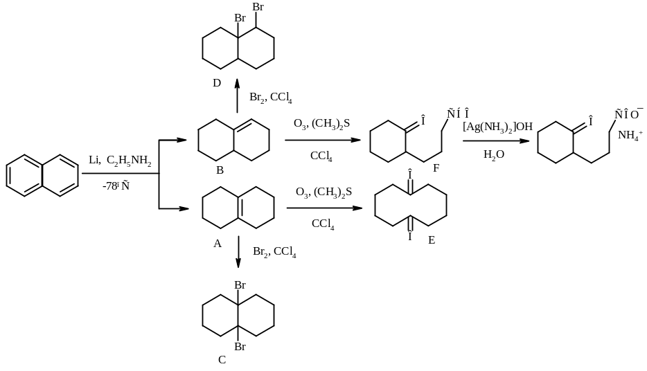 Способность продуктов А и В взаимодействовать с бромом и озоном указывает на их непредельный характер. Молярная масса C и D может быть вычислена из данных по содержанию брома: