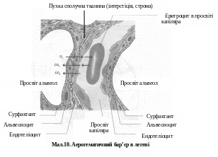Обмін газів (О2 та СО2) між альвеолярним повітрям та кров'ю проходить тільки пасивно за механізмом дифузії. Силою, яка спричиняє дифузію газів, являється різниця концентрації газів в альвеолярному повітрі та в венозній крові, яка надходить в капіляри легень.