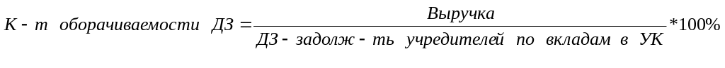 7) Коэффициент оборачиваемости дебиторской задолженности (receivable turnover ratio) (раз) рассчитывается как частное от деления выручки на величину дебиторской задолженности на конец отчетного периода без задолженности участников (учредителей) по вкладам в уставный капитал на конец отчетного периода: