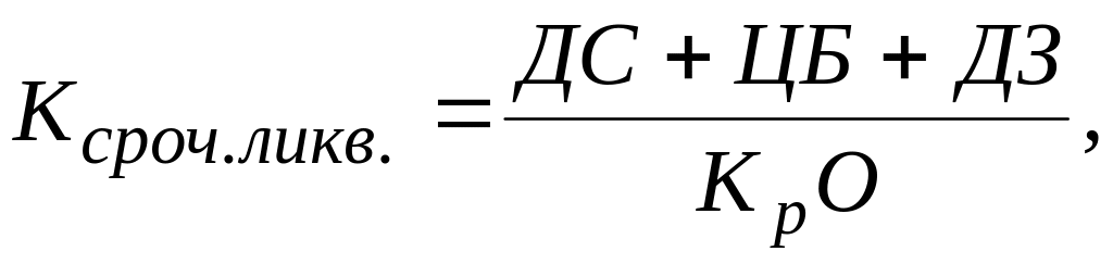 3. Коэффициент срочной ликвидности показывает, какая часть текущих обязательств может быть погашена не только за счет наличности, но и за счет ожидаемых поступлений за отгруженную продукцию, выполненные работы или оказанные услуги. Нормальным значением для этого коэффициента считается соотношение 1:1. Коэффициент срочной ликвидности рассчитывается по формуле
