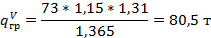 Где - паспортная геометрическая вместимость думпкара, ; -коэффициент наполнения думпкара «с шапкой» ( -1,12-1,17 принимаю 1,15); -плотность транспортируемой горной массы в целике (согласно заданию плотность коренных пород равна 1,31 т/ ) , т/ ; -коэффициент разрыхления породы в кузове думпкара ( =1,25-1,35). Так как при погрузке породы в кузов думпкара она подвергается дополнительному разрыхлению, то принемаю