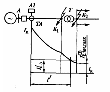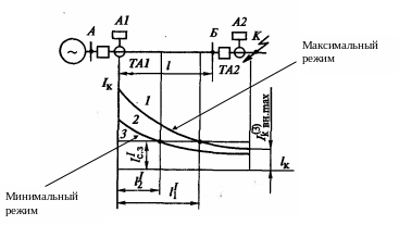 Действие защиты при КЗ на защищаемом участке обеспечивается благодаря тому, что ток КЗ в сети, а следовательно, и в защите увеличивается по мере приближения места КЗ к источнику питания (рис. 2. 1), причем кривые изменения тока КЗ имеют различную крутизну в зависимости от режима работы системы и вида (кривые 1 и 2 на рис. 2.1 соответственно для максимального и минимального режимов).