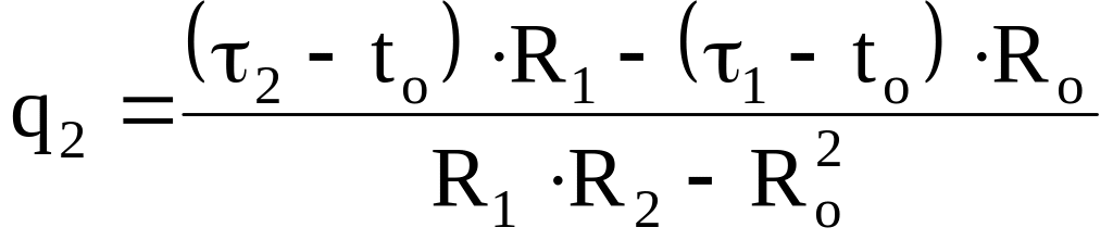 где q1, q2 – удельные тепловые потери первой (подающей) и второй (обратной) труб, Вт/м; τ1, τ2 – температура сетевой воды в подающей и обратной трубах, оС; tо – температура грунта на глубине оси трубопровода, оС; R1, R2 – суммарное термическое сопротивление (изоляции и грунта) первой и второй труб, м∙гр/Вт; Rо – условное дополнительное термическое сопротивление, учитывающее взаимное влияние соседних труб, м∙гр/Вт.