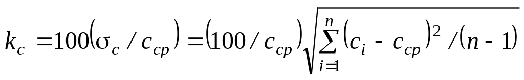 где с – среднее квадратичное отклонение содержания основного компонента, %; сср – средняя массовая доля основного компонента в смеси, %; ci – массовая доля основного компонента в i-пробе, %; n – число проб.