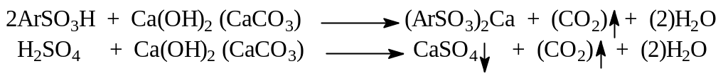 Мел и известь являются относительно дешевым сырьем. Кроме того, кальциевые соли сульфокислот в противоположность сульфату кальция, как правило, растворимы в воде, что позволяет на стадии нейтрализации избавиться от неорганических солей.