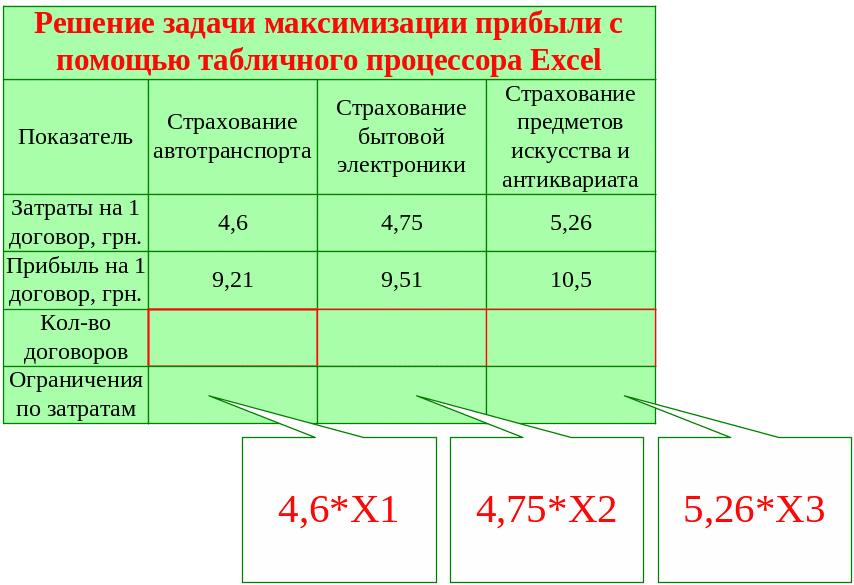 Таким образом, страховой компании для получения максимальной прибыли в сумме 400043,37 грн. следует заключить 4322 договора по страхованию автотранспорта, 25 договор страхования бытовой электроники и не заключать договоров страхования предметов искусства и антиквариата.