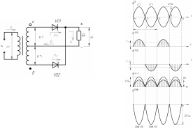 3) частота пульсаций выпрямленного напряжения вдвое выше, что приводит к уменьшению габаритов и массы сглаживающего фильтра. По величине обратного напряжения на вентиль обе схемы равноценны.