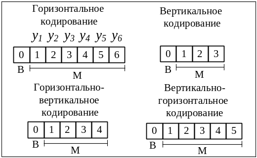 В таблице 1 использованы следующие обозначения способов кодирования МО: Г – горизонтальный, В – вертикальный, Г-В – горизонтально-вертикальный (раздельными полями), В-Г – вертикально-горизонтальный (несовместимыми подмножествами).