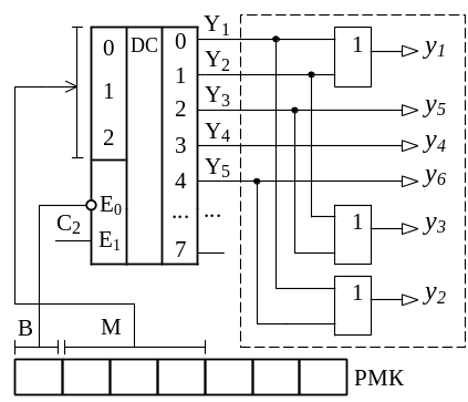Отметим, что если заданием предусмотрено вертикальное кодирование, то ФСМО можно построить двумя способами. Первый способ состоит в реализации системы булевых функций, полученных по таблице 4, на логических элементах заданного базиса. Второй способ основан на тривиальном кодировании микрокоманд (таблица 10). Соответствующий ФСМО приведен на рисунке 13.