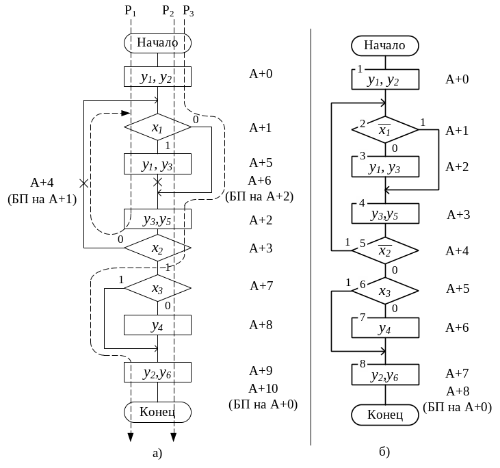 Выполнение пункта б) технологического процесса разработки МП предполагает расстановку адресов, начиная с базового адреса А+0, для каждой вершины ГСА по пути невыполнения проверяемых логических условий. Правило вычисления каждого следующего адреса – инкрементирование предыдущего (естественная адресация). Если очередная дуга приводит к вершине с уже проставленным адресом, то на этой дуге отмечается дополнительная МК безусловного перехода (на дуге между вершинами, отмеченными адресами А+5 и А+2, вставляется МК с адресом А+6, на дуге между вершинами А+3 и А+1 вставляется МК с адресом А+4).