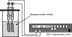 Аппаратура. Определение электропроводности растворов электролитов на практике сводится к измерению их сопротивления и последующему расчету проводимости. При измерениях необходимо принимать меры для предотвращения протекания реакций на электродах. Простейшей мерой является частое изменение направления тока, поэтому на практике чаще всего используют метод, основанный на применении переменного тока. Чем выше частота тока, тем меньше вероятность протекания химической реакции. Обычно электропроводность раствора определяют при помощи моста переменного тока (или приборов, построенных на его основе, например в настоящей работе применяется модуль «Электрохимия» учебно-лабораторного комплекса «Химия»), электрическая схема которого изображена на рис. 5.4.