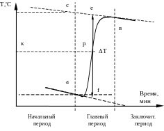 По первому способу тепловую постоянную калориметра определяют по известному значению энтальпии KCl растворения хлорида калия KCl. Для учета теплообмена и определения истинного изменения температуры весь калориметрический опыт делится на три периода (см. рис.1.4): начальный период (выход калориметрической системы на стационарный режим); главный период (протекание изучаемого процесса); заключительный период (выход калориметрической системы на стационарный режим после скачка температуры в главном периоде).