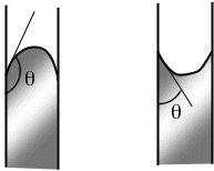 На поверхности раздела трех фаз (рис. 1.4): твердой стенки, жидкости и газа образуется краевой угол θ. Величина угла зависит только от природы соприкасающихся сред, и не зависит от формы сосуда и силы тяжести. Чем хуже смачивающая способность, тем больше краевой угол. От явления смачивания зависит поведение жидкости в тонких (капиллярных) трубках, погруженных в жидкость. При плохом смачивании жидкость в трубке поднимается над уровнем свободной поверхности, при хорошем – опускается.