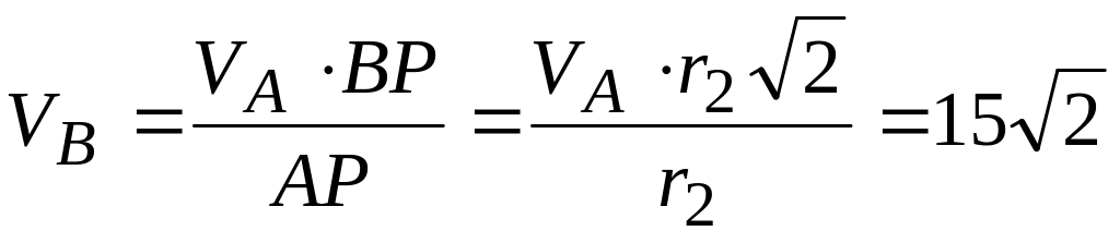 Розв’язання. Кутову швидкість шатуна, що здійснює плоскопаралельний рух, можна знайти, якщо відомі швидкості його точок. Точка спільна для шатуна і рухомого колеса. Тому необхідно розглянути спочатку розподіл швидкостей у рухомому колесі. Точка зчеплення рухомого і нерухомого коліс є миттєвим центром швидкостей рухомого колеса. Отже,